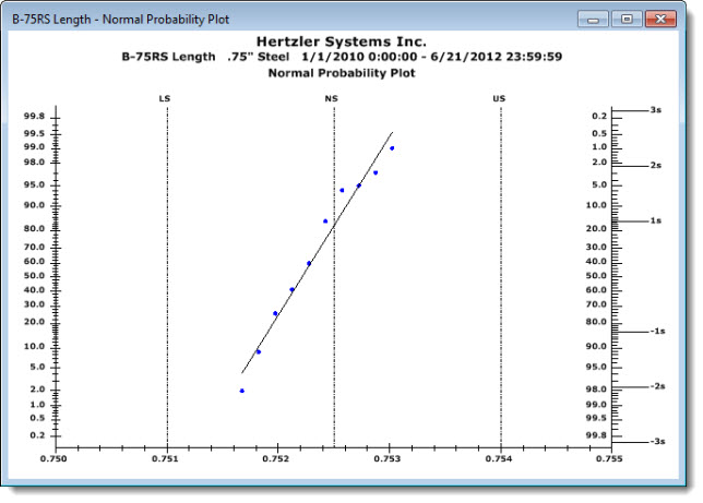The Normal Probability Plot chart helps you quickly recognize potentially non-normal distributions. Data points should plot in a linear pattern that approximates a straight line along the axis of the theoretical normal data distribution. Non-normal situations may be indicated by data trending away from the line. See examples below.