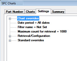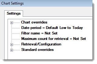 The Settings tab and Chart Settings dialog can be used to change retrieval, display, and other settings for new and existing charts. There are multiple options for changing chart settings using the Settings tab expandable tree structure.