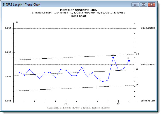 Similar to the Scatter Chart, a Trend Chart plots data points to detect trends. Control limits and the mean are calculated from the linear regression line. Knowing the trend of a process can help to predict when the process may run outside gate limits or specifications.