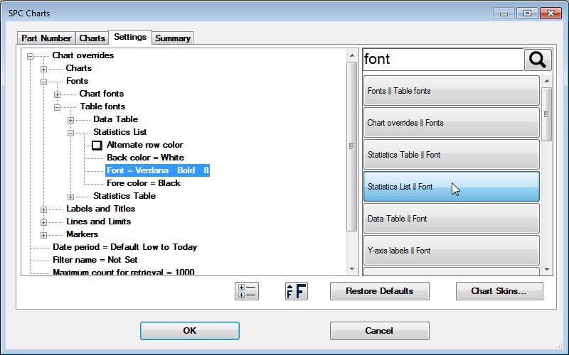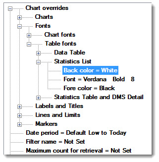 Chart overrides | Fonts | Table fonts | Statistics List | Back color =