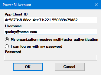 For the Username, enter your network login (email address). This must be the same address you use to log in to Power BI.