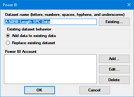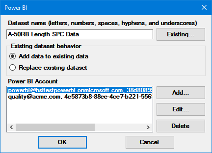To test your Power BI Account settings, click the Existing button on the Power BI window.