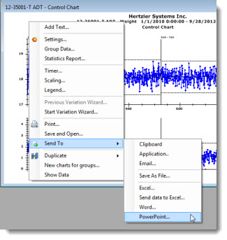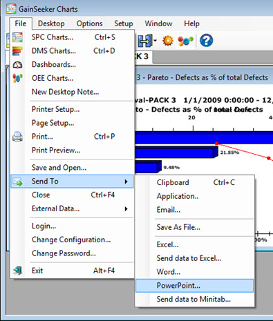 The Send To > PowerPoint option is available for charts, tables, statistics lists, dashboards, and some dashboard controls that are created using the GainSeeker Charts window.
