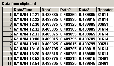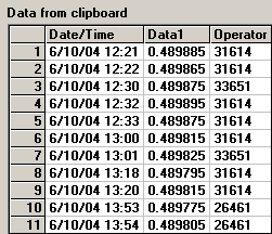 | subgroups of 3 | 3 | As only 3 complete subgroups of 3 could be created, the first two data rows in the Clipboard were ignored. Also, the date/time stamp and Operator applied to each subgroup come from the third (most recent) Clipboard row for that subgroup. |