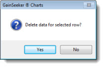 Right-click a record (row) on a Data Table that you want to delete, and then click Delete on the right-click mefnu that display, or you can click the Options menu on the GainSeeker Charts window, and then click Delete on the list that displays.