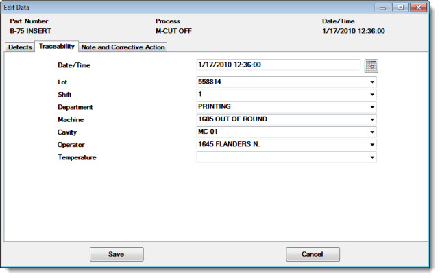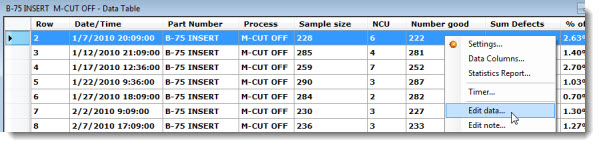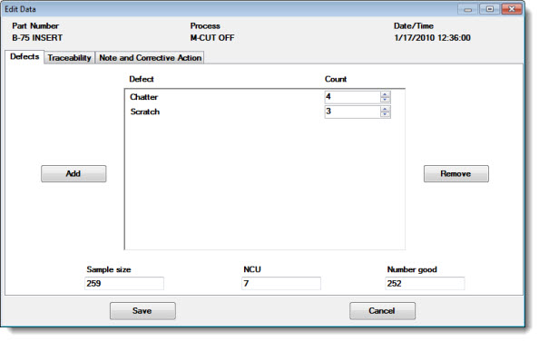 You can change the values and add or remove defect labels for this record. You can also correct the Sample size, NCU (Number of Conforming Units), and the Number good value.