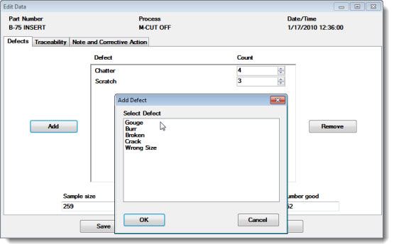 The Edit Data dialog opens with the Defects tab displayed showing the defects and values for that record.