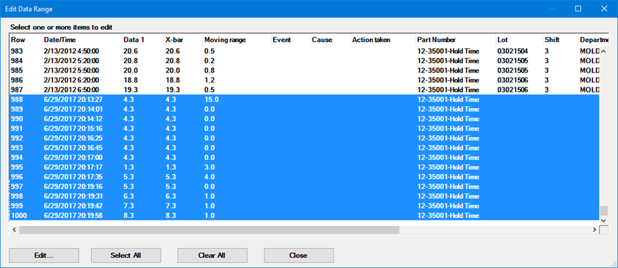 When viewing an SPC Data Table, Monitor Table, Multiple-standard Data Table, or DMS Data Table, you can apply changes to multiple data records. This can include: