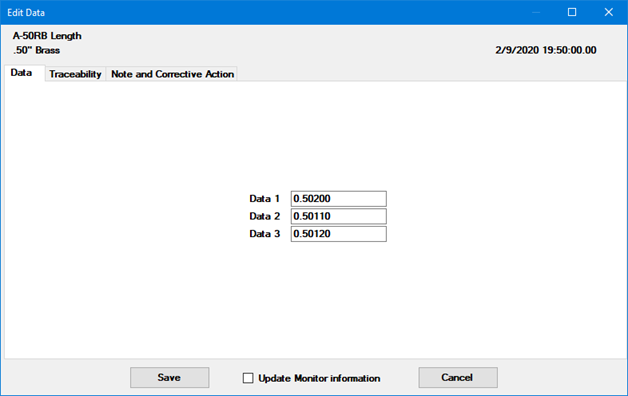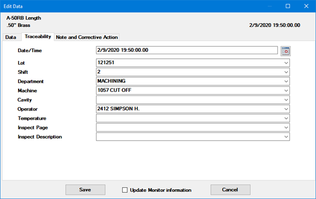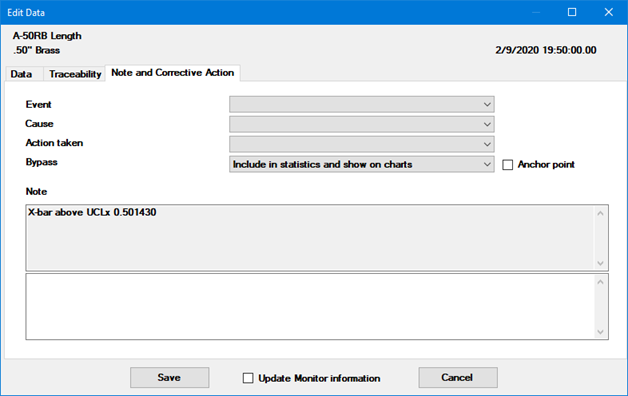 To update the corresponding record in the legacy SPC Database Monitor module, select the Update Monitor information checkbox. See Write to monitor files for information on configuring a standard to write to the Monitor.