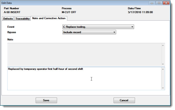 You can write a short description about what caused a defect or about the corrective action that was taken. Depending on how your GainSeeker program is configured, you may need certain access rights to edit or delete saved notes.
