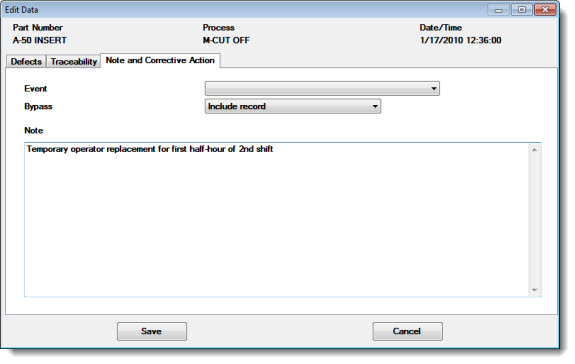 The Edit Data dialog box opens with the Note and Corrective Action tab displayed.