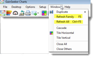 Click the Refresh button on the GainSeeker Charts toolbar to manually refresh the chart family for the selected chart window.
