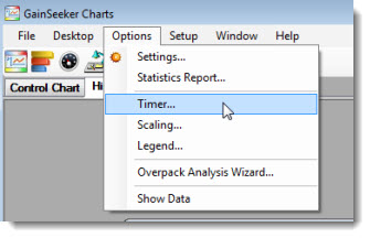Click Options on the GainSeeker Charts window menu bar. Then, click Timer... on the list that displays.