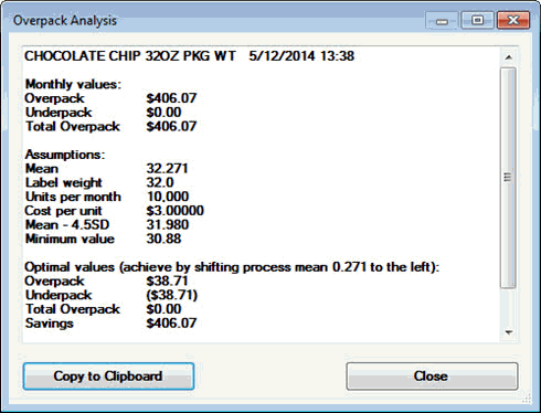 If the shifted Mean minus the Minimum Value (or Label – MAV for foods) is the limiting factor, you may want to experiment with using the What if? button on the Overpack Wizard. It can help you determine the amount of money you could possibly save if you reduce the variation by n% and shift the Mean closer to the target (or label weight), thereby shifting the process.