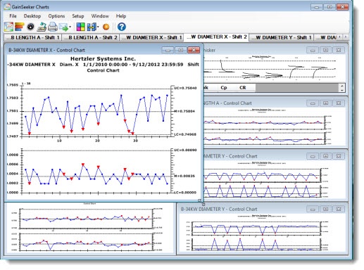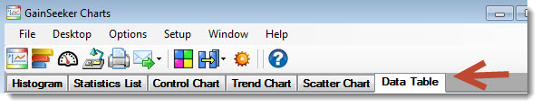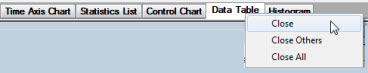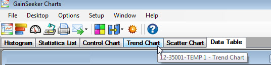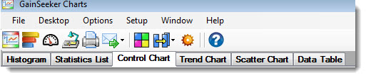Any time you have charts or dashboards open on the GainSeeker Charts window, an identification tab corresponding to each chart or dashboard displays. One of the tabs will be highlighted, which visually separates it from the others (and selects that chart or dashboard). In the following example, a tab for a Control Chart is highlighted indicating that chart is selected.