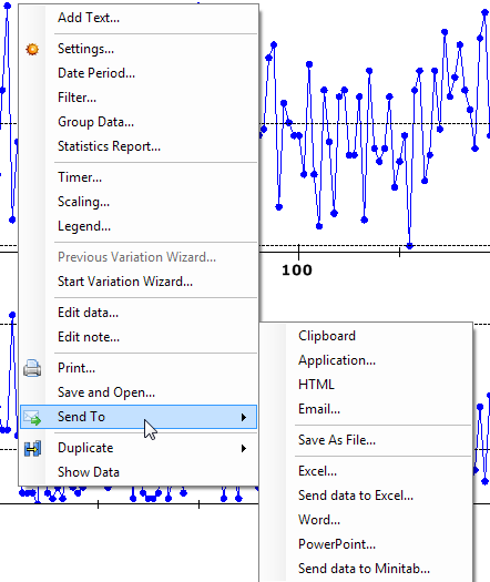 Note: This toolbar button provides only a limited set of options that apply to all chart types. For a complete list of Send To options, use one of the other methods to send a chart (File menu or right-click menu).