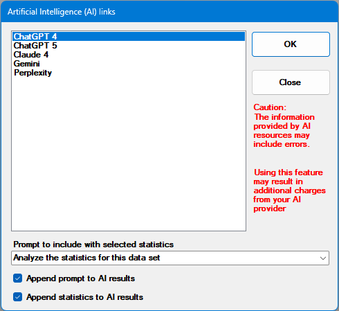 Posts a defined set of statistics for the current chart to an Artificial Intelligence (AI) website for analysis. The AI website link must be defined in the System-wide settings section on the Configuration tab of the Administration module. If more than one AI link is defined, the user will be asked to select which AI link to use. The prompt for the selected link is displayed at the bottom of the dialog and can be changed temporarily before sending. The user may choose to append the prompt and/or the statistics that were sent to the website to the end of the results by using the Append prompt to AI results and Append statistics to AI results checkboxes. The user must have Send To AI rights in their Role.