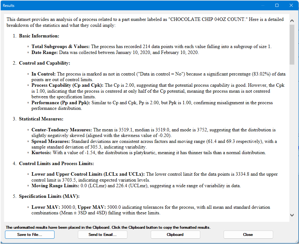 The results of the AI analysis are copied to the clipboard and displayed on a dialog. The dialog allows the user to save the results to a HTML file or share via email.