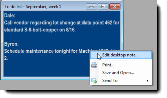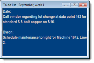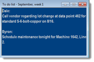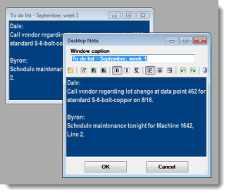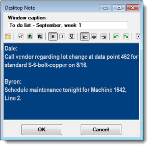You can easily create a Note window that can be saved alone as a desktop or added to a desktop along with SPC charts, DMS charts, and dashboards. This can be useful for collaborating with others or for keeping a list of action items.