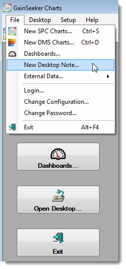 Click the File menu on the GainSeeker Charts window. Then, click New Desktop Note... on the list that opens: