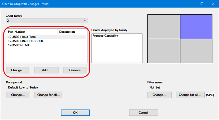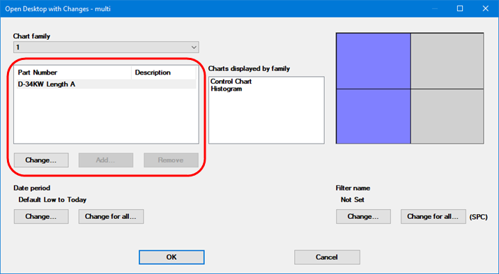 For these types of chart families and dashboard retrievals, you can follow these steps to temporarily change which Part Numbers and/or Processes will be analyzed: