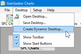 Click Desktop on the GainSeeker Charts window menu. Then, click Create Dynamic Desktop. For more information, see Dynamic Desktops.