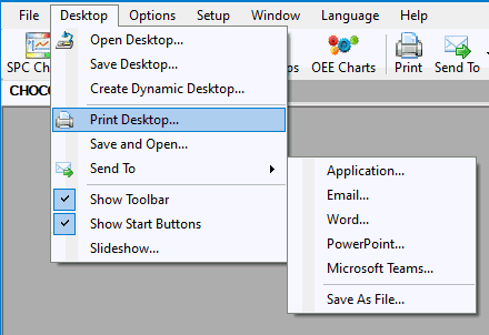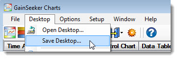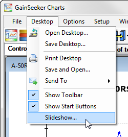 Open the chart and dashboard windows you want to view as a Slideshow. Click the Desktop menu on the GainSeeker Charts window, and then click Print Desktop on the menu that displays.