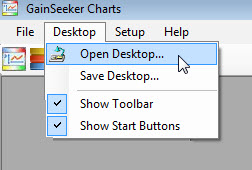 Click Desktop on the GainSeeker Charts window menu. Then, click Open Desktop... to display the Open Desktop dialog. The Open Desktop dialog opens. See Opening Desktops for usage information.