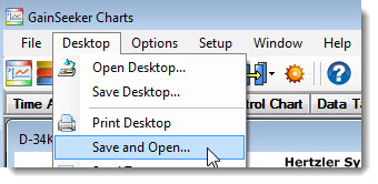 Open the chart and dashboard windows you want to view as HTML. Click Desktop on the GainSeeker Charts window menu. Then, click Save and Open... on the menu that displays: