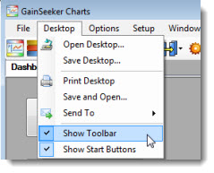 Click Desktop on the GainSeeker Charts window menu (Fig. 1). Then, click the checkbox preceding Show Toolbar to select it and display the Toolbar (Fig. 2), or click the checkbox to clear it so the toolbar do not display. Fig. 1 |