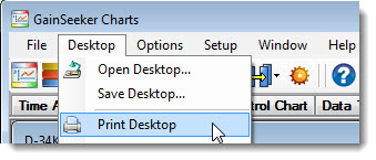 Open the chart and dashboard windows you want to print. Click the Desktop menu on the GainSeeker Charts window, and then click Print Desktop on the menu that displays.
