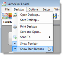 Click Desktop on the GainSeeker Charts window menu (Fig. 1). Then, click the checkbox preceding Show Start Buttons to select it and display the quick-start buttons (Fig. 2), or click the checkbox to clear it so the buttons do not display. Fig. 1 |
