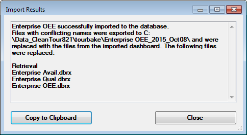 If items in the imported dashboard have overwritten existing items in the GainSeeker database, this window will explain which items were overwritten and where backup copies of those items were stored. You can import these items back into GainSeeker by editing the dashboard and then editing the controls that reference those items.