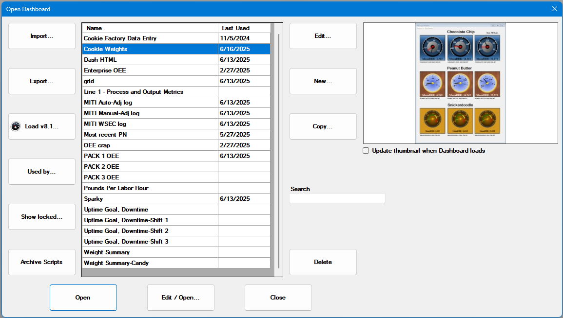 These functions are accomplished using the Open Dashboard dialog box in the GainSeeker Charts module. See Accessing the Open Dashboard dialog box.