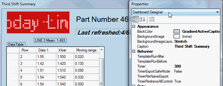 The dashboard window and the Properties dialog opens in Dashboard Designer mode. See Using the Properties dialog