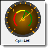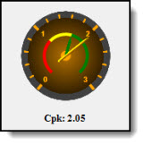 Using this scenario, the Dial Gage region colors may look similar to this on a gage displaying Cpk data.