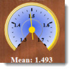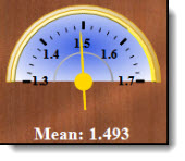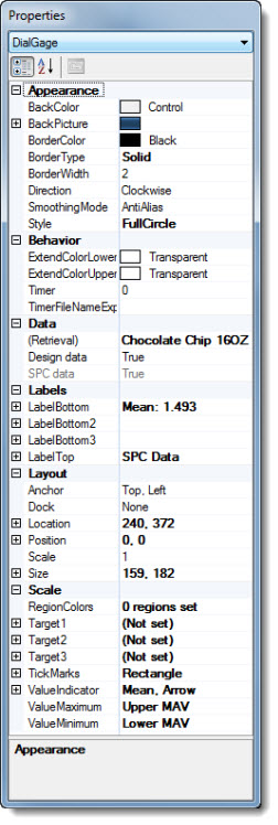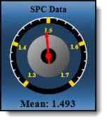 This example of a Dial Gage control has four labels containing multiple statistics and user-added text. To allow room for four labels, the gage has also been resized and repositioned on the control using the Scale property and Position property respectively.