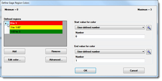 The Start value for color drop-down list has been set to the User-defined number and given a value of 0 in the Number text field for this region. The End value for color drop-down list has been set to the User-defined number setting and given a value of 1 in the Number text field for this region. (Other statistics can also be selected from the drop-down lists.) Thus, the range setting for the red bar is 0 to 1; the yellow bar, 1 to 1.67; and the green bar, 1.67 to 3.