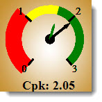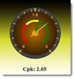 A common use of a fixed target indicator is to point it to an ideal data point such as in the following example, in which the target indicator (white pointer) is fixed at the Cpk 1.67 point. Additional related target indicators could be added to the gage such as one fixed at the ideal Cp point and another fixed at the ideal Cr point.