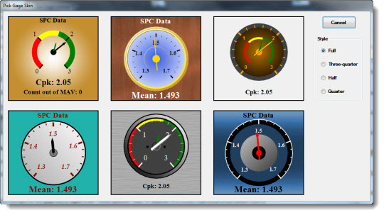 Choose one of six ready-to-use skins to monitor key process indicators along with multiple statistics and user-selected text on a gage. Optionally use color recognition to define acceptable, unacceptable, and cautionary data zones on the gage.