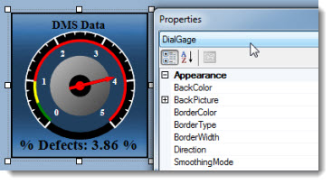 The Dial Gage control opens on the host dashboard window in design/edit mode. The Properties dialog menu changes to display the DialGage setting and the properties grid displays the properties specific to this control.