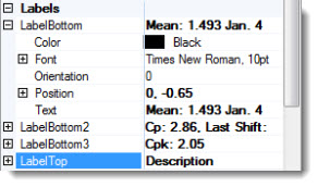 Use the Labels property to display up to four labels with multiple statistics and user-added text on the control. In this example of the Labels property, the LabelBottom subproperty list has been expanded. The subproperties are the same for LabelBottom2, LabelBottom3, and LabelTop.