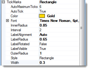 The TickMarks subproperties in the Properties dialog below, followed by a gage with tick marks and their respective numerals diagrammed in gold.