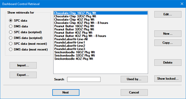 For an SPC data or DMS data retrieval, the Retrieval Settings for Dashboard Controls window is displayed.
