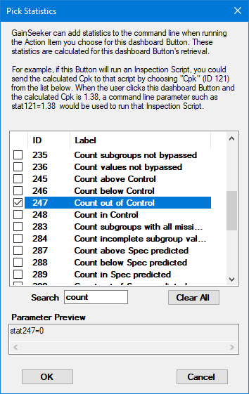 When the user clicks this Dashboard button, its Action will be launched with command line parameters for the statistics you choose here.