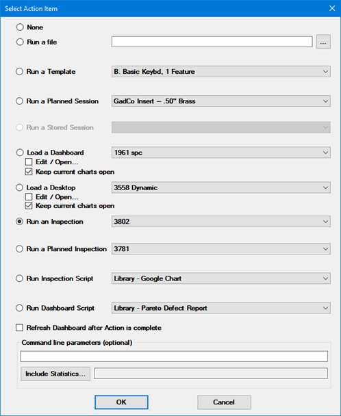 You can optionally use command line parameters with the Run a File, Run a Template, Run a Planned Session, Run a Stored Session, Run an Inspection, Run a Planned Inspection, and Run Inspection Script options on the Select Action Item window. For more information, see Setting up shortcuts to perform automatic functions.