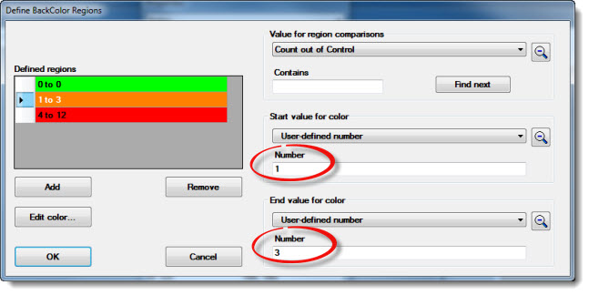 On the above example, the Define BackColor Regions dialog has three defined background color regions—green, orange, and red—as shown in the Defined regions grid.