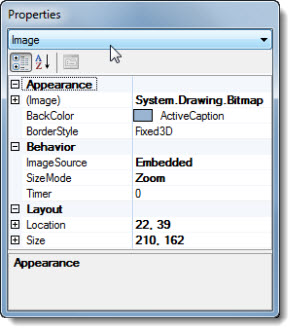 The Properties dialog menu displays the Image setting and the properties grid displays the properties specific to this control.