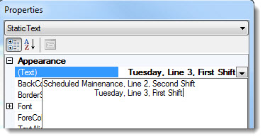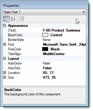 The Properties dialog menu changes to display the Static Text setting and the properties grid displays the properties specific to this control.