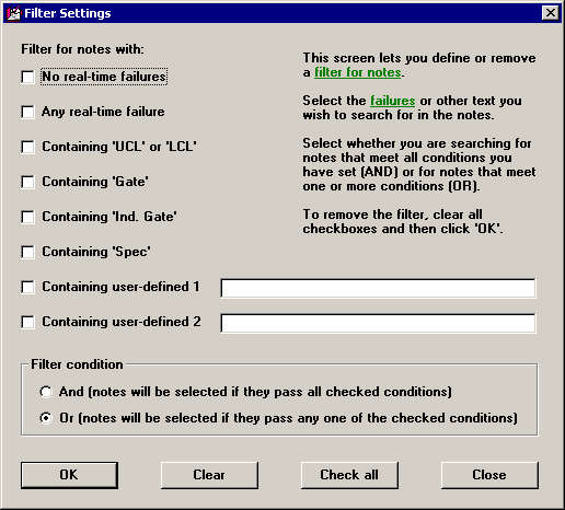 In the Filter for notes with list, select the check box for each real-time failure you want to display. You can also use the user-defined 1 and user-defined 2 boxes to enter any other text for which you want to filter the notes.